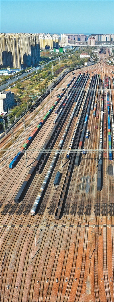 編組集結(jié)完成的貨物列車在鄭州北站有序排列。王瑋 攝(影像中國(guó))