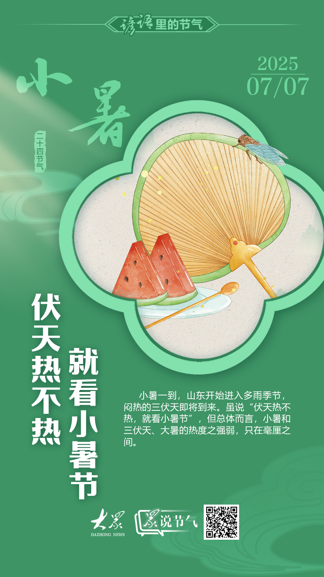 小暑一到,陽光熾烈,但古人認為天氣剛開始炎熱,還沒達到極熱的程度,因此稱“小暑”。山東開始進入多雨季節(jié),悶熱的三伏天即將到來。俗諺云:“伏天熱不熱,就看小暑節(jié)?!笨傮w而言,小暑和三伏天、大暑的熱度之差,只在毫厘間。