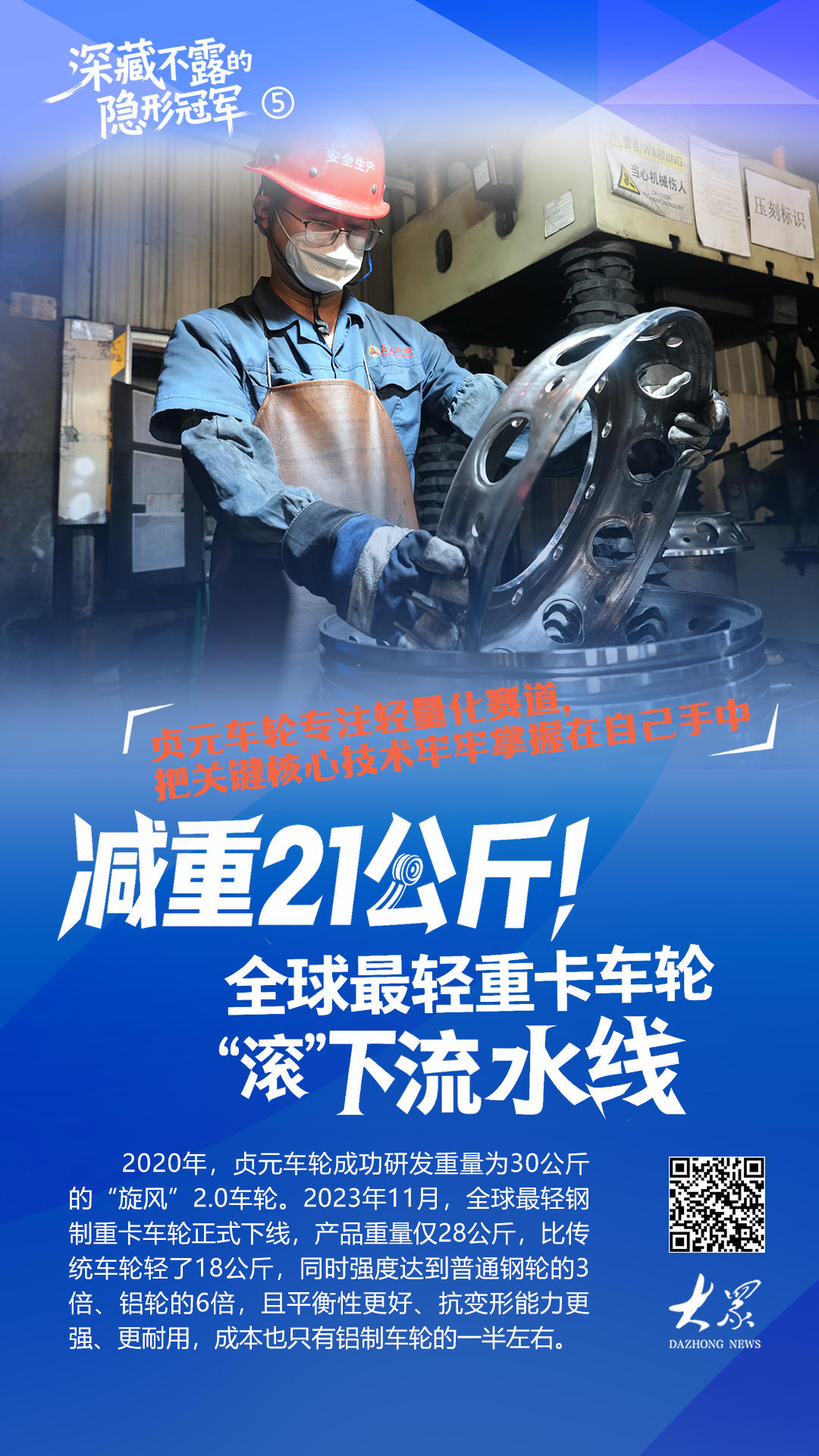 創(chuàng)新路上沒有終點(diǎn)。2020年,貞元車輪成功研發(fā)重量為30公斤的“旋風(fēng)”2.0車輪。2023年11月,全球最輕鋼制重卡車輪正式下線,產(chǎn)品重量?jī)H28公斤,比傳統(tǒng)車輪輕了18公斤,同時(shí)強(qiáng)度達(dá)到普通鋼輪的3倍、鋁輪的6倍,且平衡性更好、抗變形能力更強(qiáng)、更耐用,成本也只有鋁制車輪的一半左右。