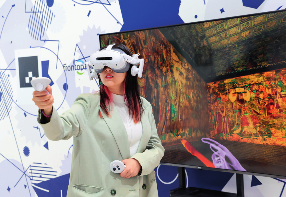 觀眾在第二十一屆中國(guó)(深圳) 國(guó)際文化產(chǎn)業(yè)博覽交易會(huì)上體驗(yàn) VR 修 復(fù)永樂宮壁畫(2025 年 5 月 23 日攝) 梁旭攝 / 本刊