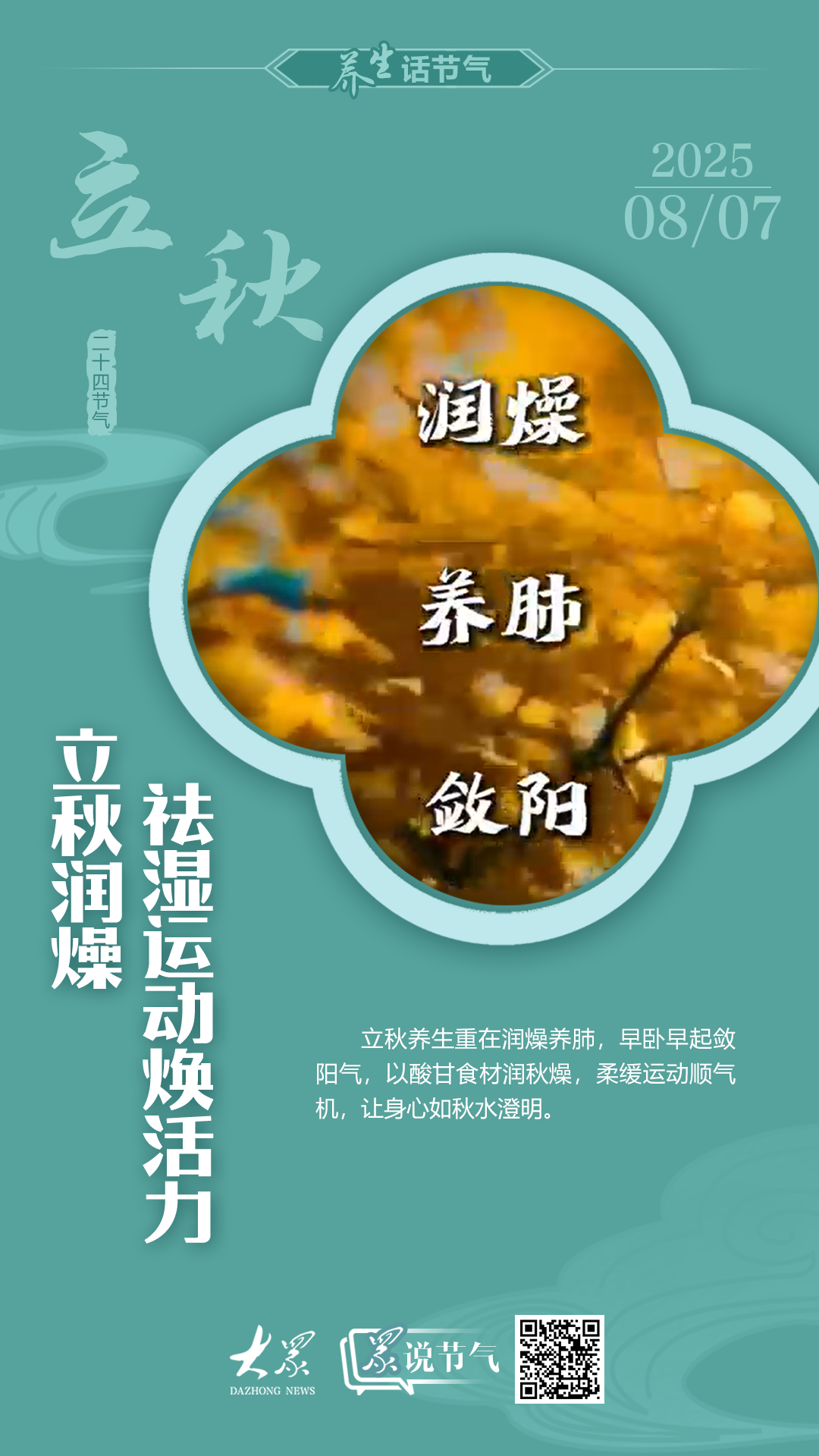 “云天收夏色,木葉動秋聲?!绷⑶飳⒅?,暑熱未消而秋涼漸起。作為夏秋之交的關鍵節(jié)氣,此時養(yǎng)生當注重"潤燥、養(yǎng)肺、斂陽"三大原則。