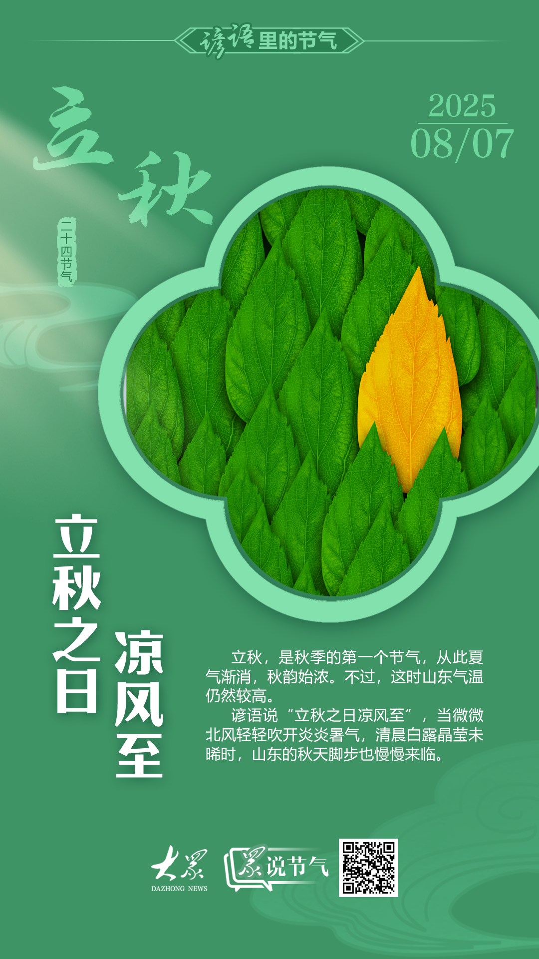 立秋,是二十四節(jié)氣中的第十三個節(jié)氣,秋季的第一個節(jié)氣?!傲ⅰ?,意味著開始;“秋”,則象征著禾谷成熟。此時節(jié),陽氣漸收,陰氣漸長,整個自然界開始從繁茂成長向成熟過渡。