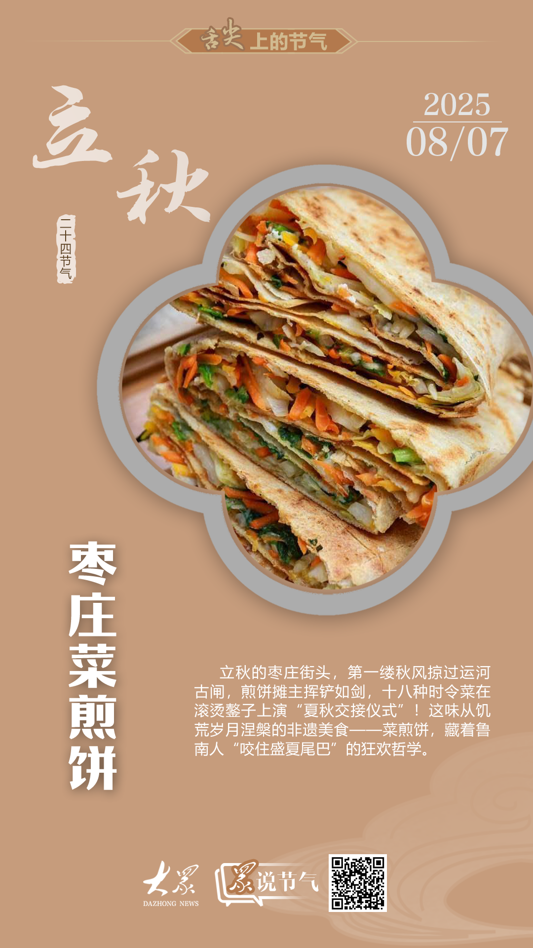 俗話說,“立秋吃渣,腰不疼腿不麻!”棗莊方言稱菜餡為“渣”,立秋吃菜煎餅稱“咬渣”,實為借百蔬纖維掃除夏季積滯的濕熱。夏末秋初的清晨,煎餅攤主直奔菜市,專挑“跨界鮮貨”——末伏冬瓜絲(祛濕)搭初秋嫩南瓜(健脾),紫茄條(解暑)纏新茬白蘿卜絲(順氣),野莧菜(排毒)拌頭茬花生碎(潤燥)……一口咬下,仿佛吞進了整個微山湖的生態(tài)平衡。