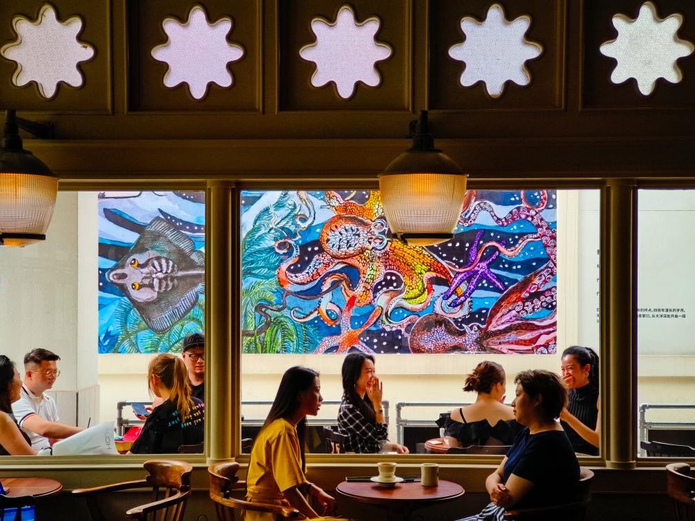 人們?cè)诔啥即笤粗醒牍珗@內(nèi)咖啡館喝咖啡。新華社記者 沈伯韓 攝