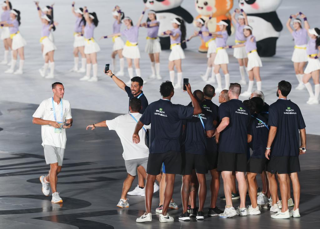 8月7日,巴西體育代表團(tuán)成員在開(kāi)幕式現(xiàn)場(chǎng)自拍留念。 新華社記者 姜克紅 攝