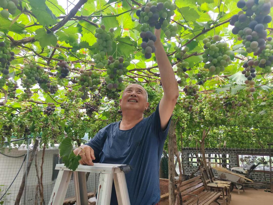 洪門村葡萄架下,藏著山亭“土特產(chǎn)”的破繭密碼。沿著蜿蜒山路走進村子,2000余畝葡萄田順著山勢鋪展,陽光玫瑰、巨峰等四大系列40多個品種錯落有致。老人搖著蒲扇,家門口石凳上擺放著自家釀造的葡萄酒、土雞蛋等?!按謇?00多戶,戶戶種葡萄,各類葡萄采摘園300余處,還發(fā)展起了采摘游?!贝逯鴧畏钚耪f。