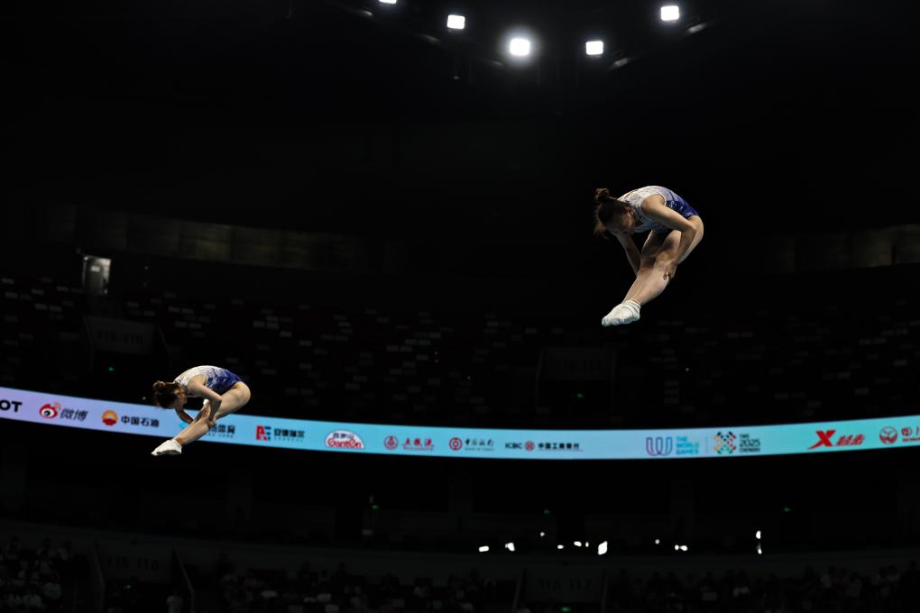 當晚,最多容納1.8萬人的東安湖體育公園多功能體育館里,掌聲、歡呼聲雷動。在成都世運會蹦床女子雙人同步決賽中,中國隊組合胡譯乘/張欣欣仿佛一對藍色“錦鯉”,在空中“神同步”,最終力克日本隊,以51.34分摘得桂冠。