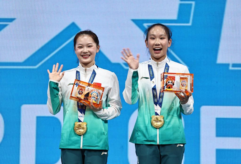 8月10日,冠軍中國組合胡譯乘(左)/張欣欣在頒獎儀式上。新華社記者 孫凡越 攝