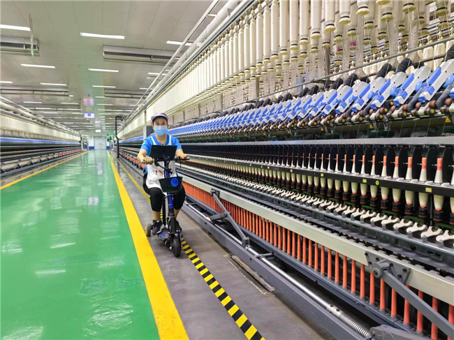 7月14日,山東魏橋創(chuàng)業(yè)集團(tuán)的紡織車間內(nèi),一名女工正在巡查紡紗生產(chǎn)線。