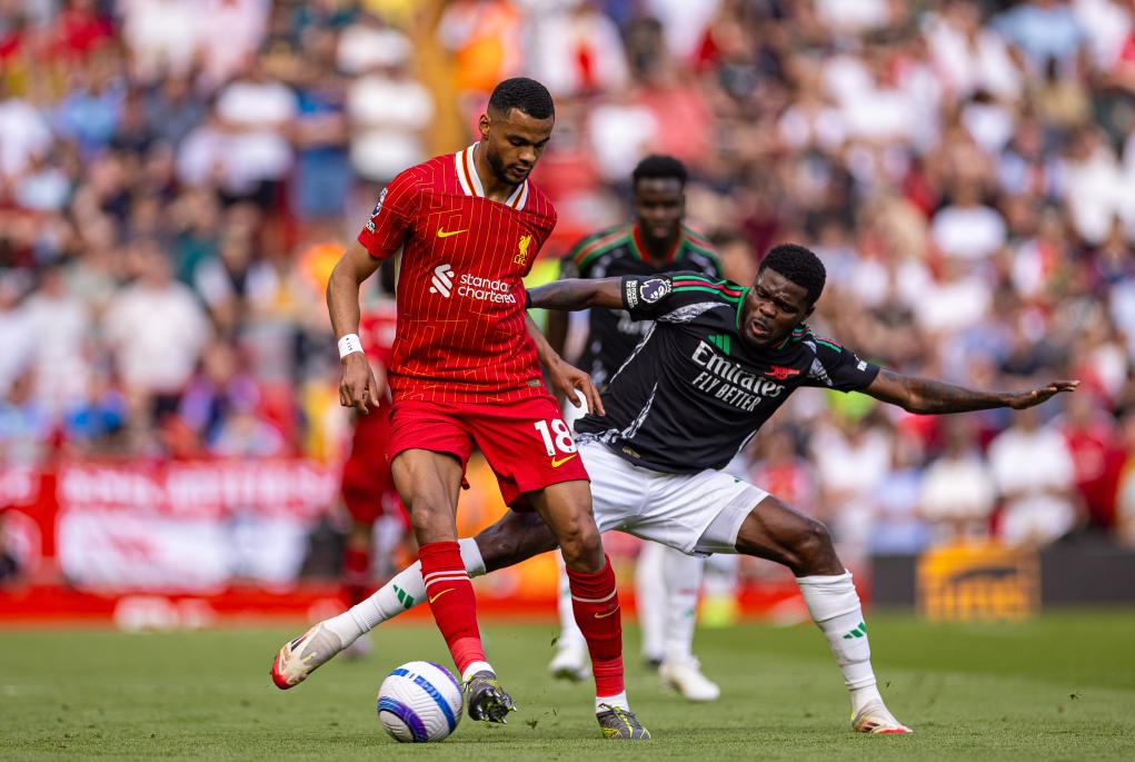 5月11日,阿森納隊(duì)球員與利物浦隊(duì)球員拼搶。當(dāng)日,在2024-2025賽季英格蘭足球超級(jí)聯(lián)賽第36輪比賽中,阿森納隊(duì)客場(chǎng)2:2戰(zhàn)平利物浦隊(duì)。新華社發(fā)