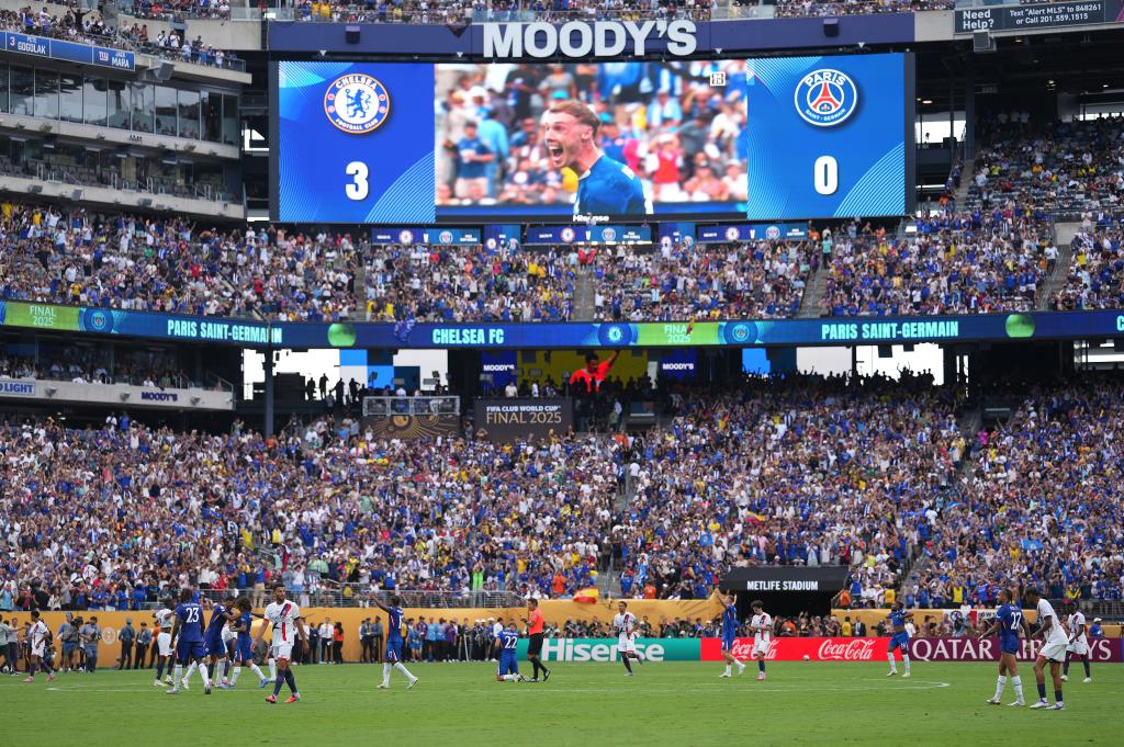 7月13日,在美國(guó)新澤西州進(jìn)行的2025年國(guó)際足聯(lián)俱樂部世界杯(世俱杯)決賽中,英格蘭切爾西隊(duì)3:0戰(zhàn)勝法國(guó)巴黎圣日耳曼隊(duì),奪得冠軍。新華社記者 許暢 攝