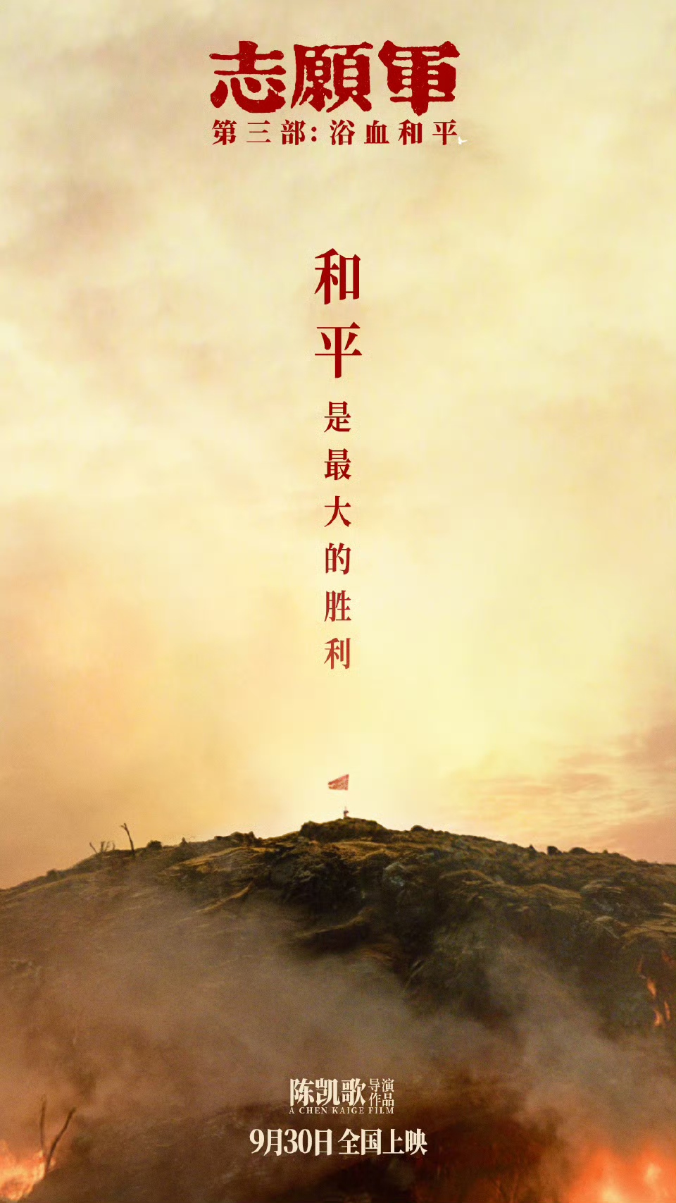 由陳凱歌執(zhí)導(dǎo)的電影《志愿軍:浴血和平》9月23日官宣預(yù)售開啟,同時(shí)發(fā)布“念想”預(yù)告。作為《志愿軍》三部曲系列收官之作,影片不僅呈現(xiàn)了“邊打邊談”的全新戰(zhàn)局,其情感的厚度與濃度也推向頂峰。預(yù)告以李曉(張子楓 飾)尋父的念想引入,呈現(xiàn)三部曲眾角色攜各自念想一路浴血奮戰(zhàn)的風(fēng)雨歷程,在跌宕起伏的戰(zhàn)局中見證一位位志愿軍戰(zhàn)士心底最樸素而真摯的牽掛。在前兩部影片中,不少觀眾就被李家三口的親情、松骨峰三連戰(zhàn)士們的戰(zhàn)友情打動(dòng),如今最終章將角色間的情感線索凝聚于一處,給觀眾帶來更強(qiáng)烈的觸動(dòng)與共鳴。影片同步釋出的“和平曙光”新媒體海報(bào),以陣地上屹立不倒的旗幟,訴說著焦土之上永不墜落的和平信念。