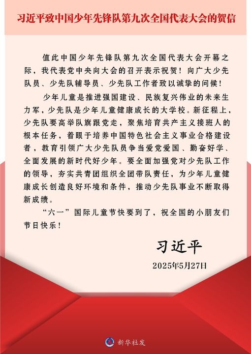 新華社北京5月27日電?“六一”國際兒童節(jié)即將到來之際,中國少年先鋒隊第九次全國代表大會27日上午在京開幕。中共中央總書記、國家主席、中央軍委主席習近平發(fā)來賀信,代表黨中央向大會的召開表示祝賀,向廣大少先隊員、少先隊輔導員、少先隊工作者致以誠摯的問候,并祝全國的小朋友們節(jié)日快樂。