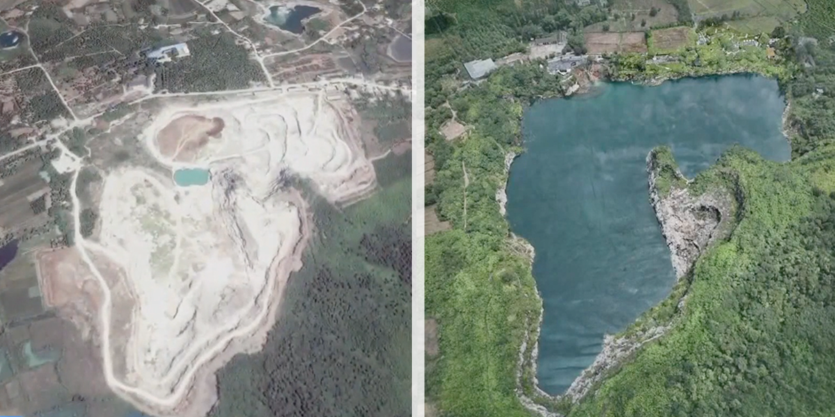 △浙江安吉曾經(jīng)最大的石灰?guī)r礦坑復綠改造后,變成有山有水的生態(tài)度假區(qū)。