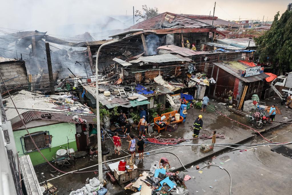 8月6日,在菲律賓馬尼拉一貧民窟大火現(xiàn)場,居民和消防員參與滅火。新華社發(fā)(烏馬利攝)