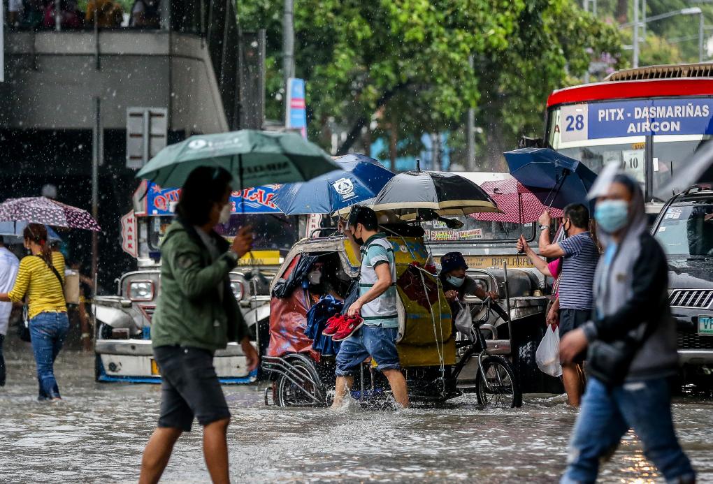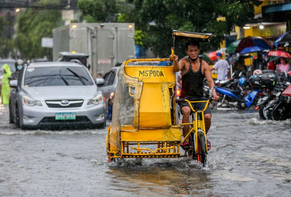 2021年7月21日,行人在菲律賓馬尼拉街頭的積水中前行。新華社發(fā)(烏馬利攝)