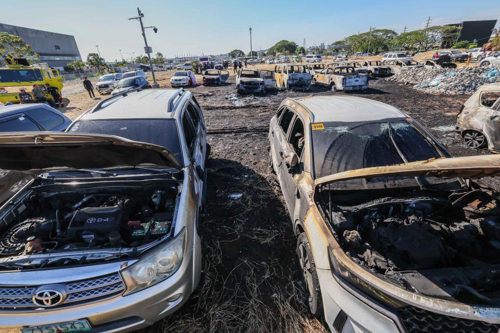 這是2024年4月22日在菲律賓尼諾伊·阿基諾機場的一處停車場拍攝的被燒毀的車輛。新華社發(fā)(烏馬利攝)